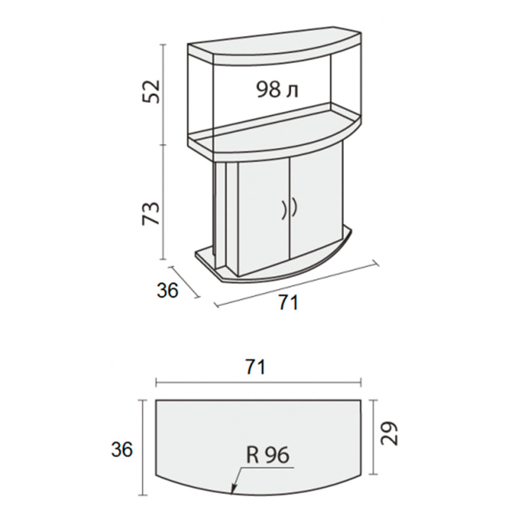 Базовый комплект состоит из аквариума, светильника и тумбы с дверями из ламинированного ДСП (ЛДСП). Фактический объем аквариума составляет 98 литров. Габариты аквариума 71x33x46 см. см. (ДхШхВ). Каждый аквариумный комплект Панорама – это базовая модель, в которой Вы имеете дополнительную возможность выбрать:
