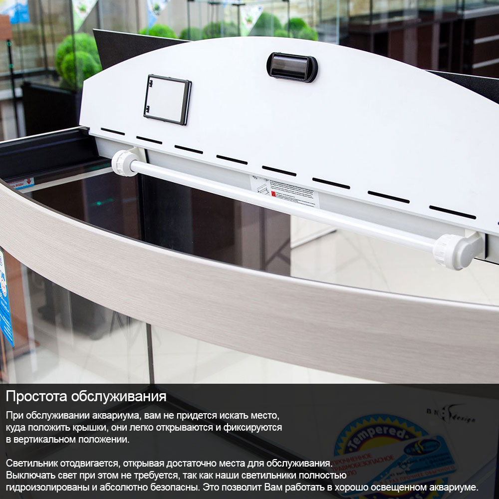 • Крышка аквариумов Биодизайн оснащена двумя покровными крышками (створки). При обслуживании аквариума, вам не придется искать место, куда положить створки, они легко открываются и фиксируются в вертикальном положении. Створки полностью съемные;