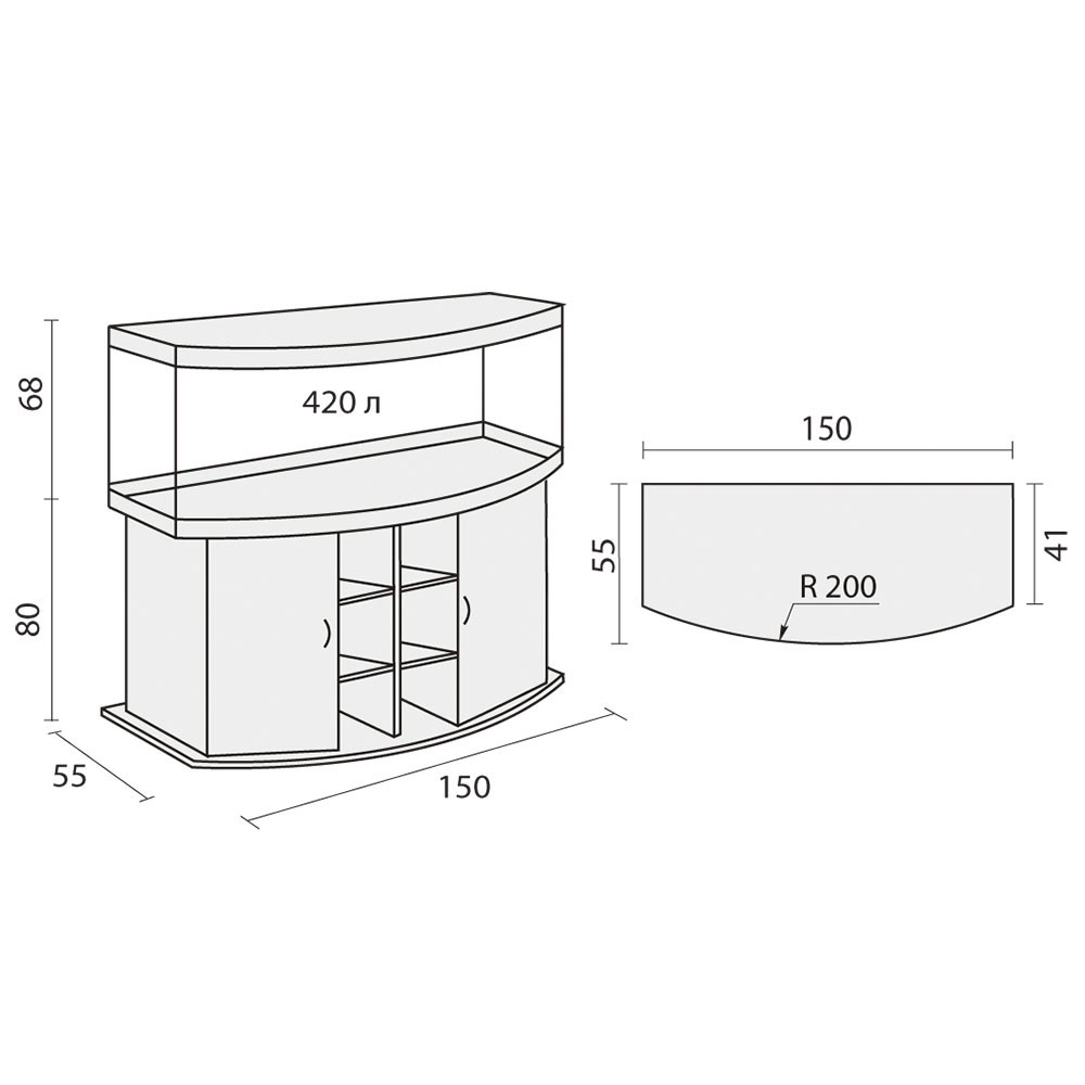 Базовый комплект состоит из аквариума, светильника и тумбы с дверями из ламинированного ДСП (ЛДСП). Фактический объем аквариума составляет 420 литров. Габариты аквариума 151x56x68 см. (ДхШхВ). Каждый аквариумный комплект Панорама – это базовая модель, в которой Вы имеете дополнительную возможность выбрать: