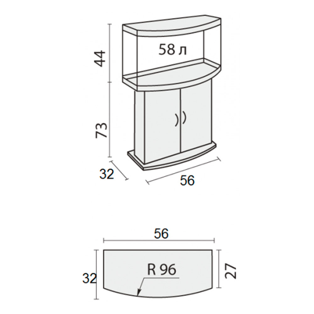 Базовый комплект состоит из аквариума, светильника и тумбы с дверями из ламинированного ДСП (ЛДСП). Фактический объем аквариума составляет 58 литров. Габариты аквариума 56x32x44 см. (ДхШхВ). Каждый аквариумный комплект Панорама – это базовая модель, в которой Вы имеете дополнительную возможность выбрать: