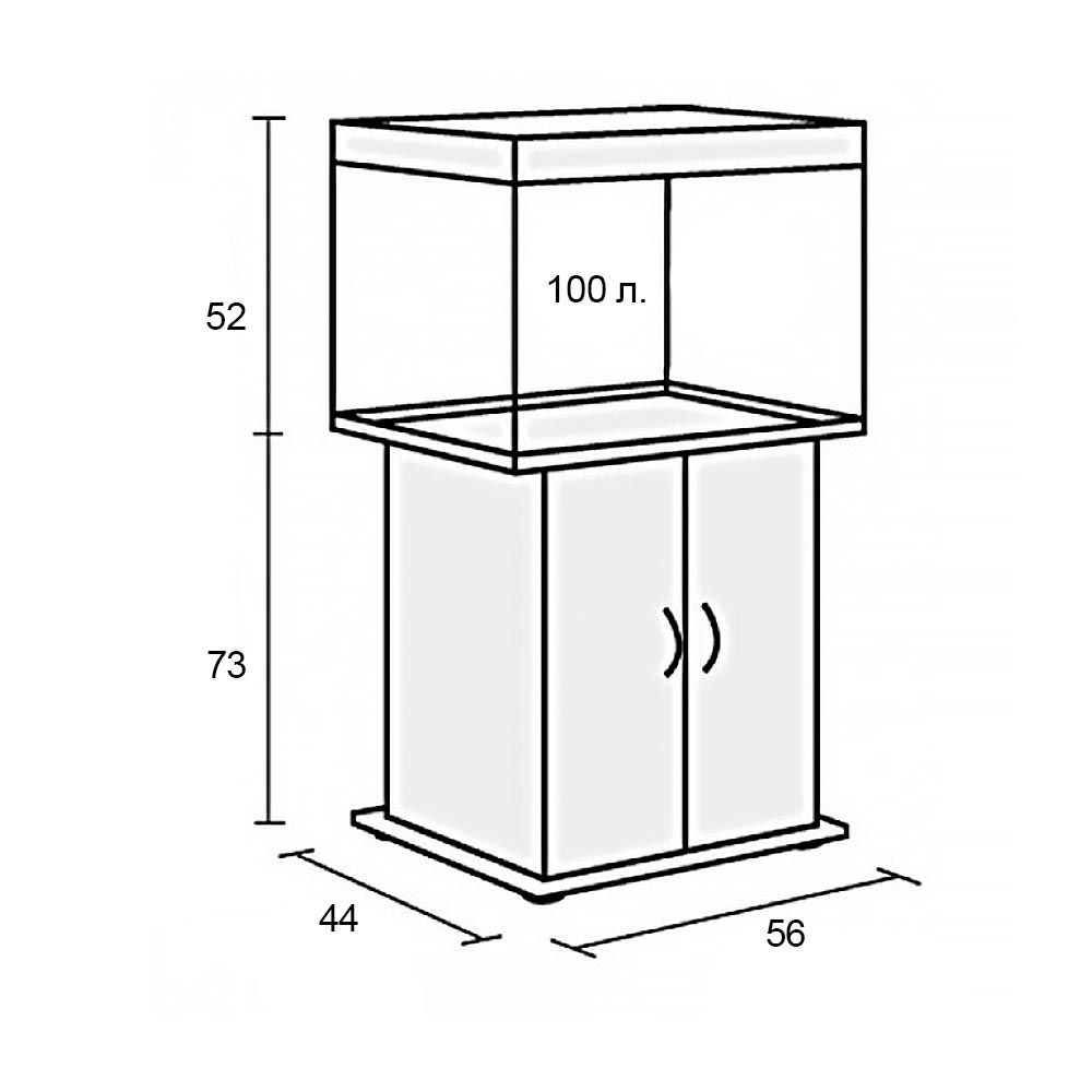 Базовый комплект состоит из аквариума, светильника и тумбы с дверями из влагостойкого ламинированного ДСП (ЛДСП). Фактический объем аквариума составляет 100 литров. Габариты аквариума 56x44x52 см. (ДхШхВ). Каждый аквариумный комплект Риф – это базовая модель, в которой Вы имеете дополнительную возможность выбрать: