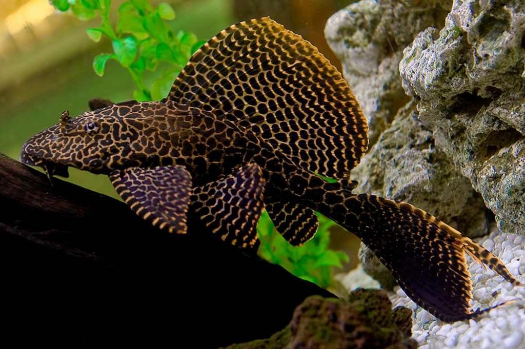 Парчовый Птерегоплихт хорошо смотрится в аквариуме с понятным подбором совместимых обитателей. По характеру это крупный донный сом. Ориентировочный размер взрослой рыбы: до 35-50 см. Минимальный объем аквариума: от 250 л.